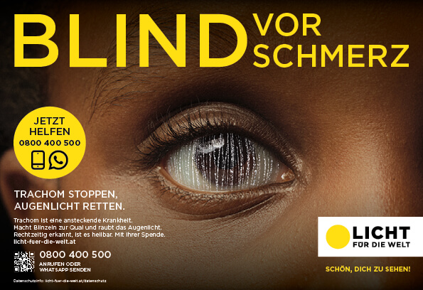 Um das zu erreichen, wagt Licht für die Welt auch beim Werbekonzept und in der Umsetzung Neues – mit einem auffälligen Key Visual und einer einprägsamen Headline: “Blind vor Schmerz: Trachom stoppen, Augenlicht retten”. Das Ziel der Kampagne ist es, das Ausmaß der Qualen für Betroffene spürbar zu machen – und mit einem besonderen Special Effect sogar hörbar werden zu lassen.